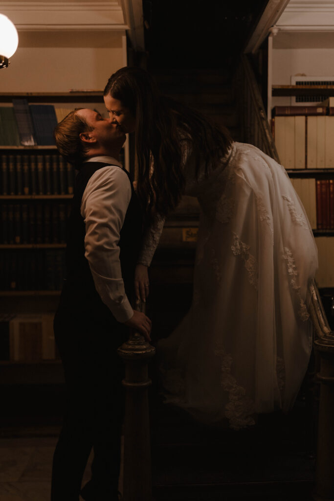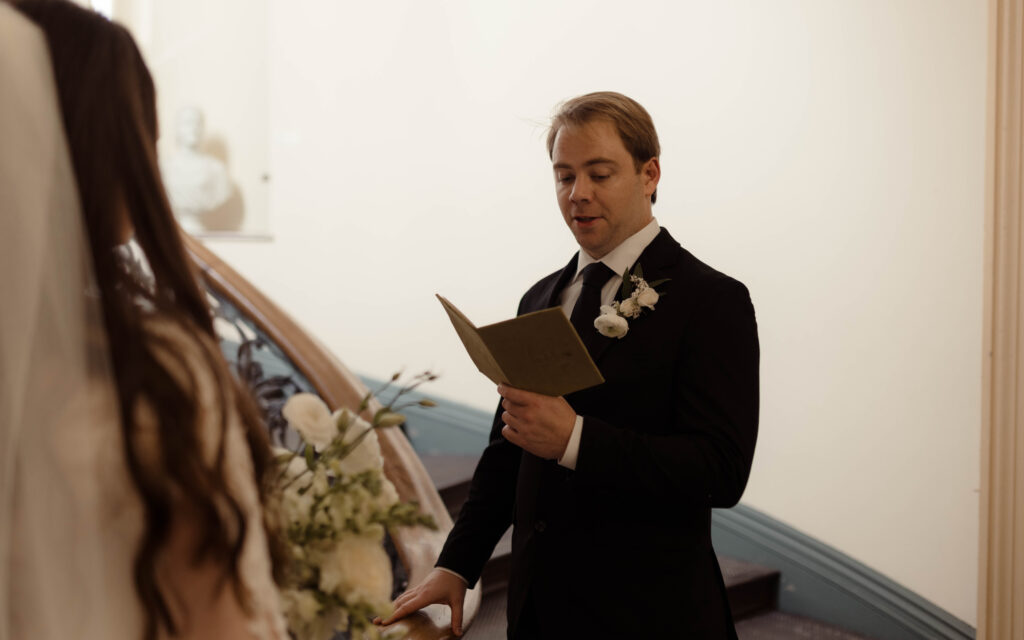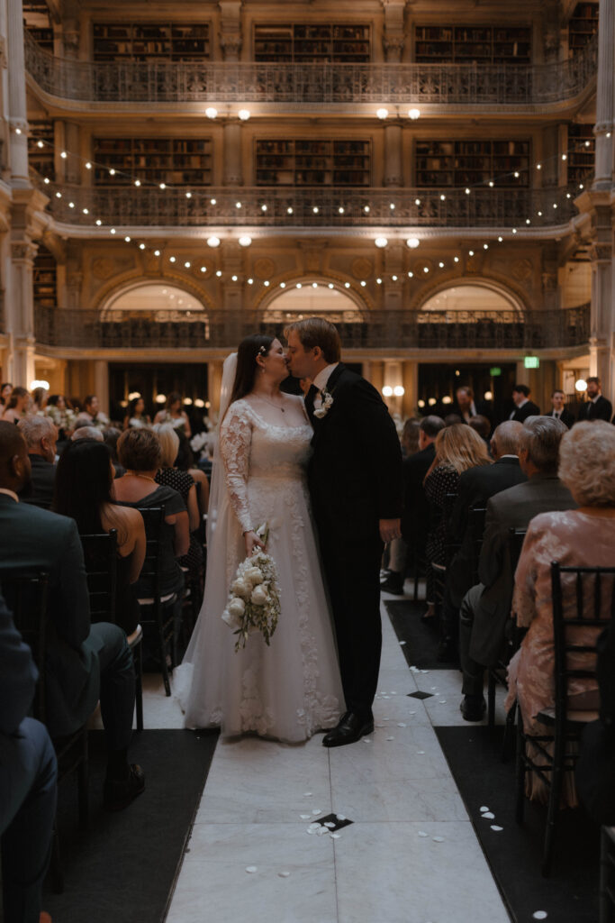 One of the most memorable moments of the day was their private vow reading and first look on the grand staircase of the Peabody Library. It’s a space that feels suspended in time, and as they stood together, surrounded by rows of antique books and ornate ironwork, it was clear they had chosen a setting that perfectly mirrored their story: elegant, timeless, and deeply personal.