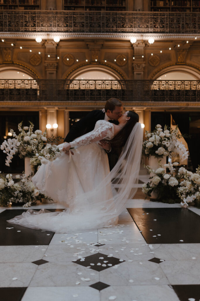 The ceremony and reception followed in the same venue, with the library’s soaring architecture creating a cinematic backdrop for everything from their exchange of vows to the late-night dancing. Guests mingled beneath the towering shelves, cocktails in hand, music filling the air, laughter carrying through the halls. It was high-end luxury without ever feeling overdone. A wedding that felt both grand and relaxed, exactly as Madison and Gabriel intended.
