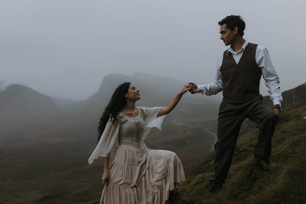 For adventurous couples who don’t mind a hike, the Old Man of Storr delivers unparalleled views of the island. Towering stone pillars rise dramatically from the landscape, offering a striking, editorial setting for luxury elopement photography. Sunrise sessions here are extraordinary and often reward couples with soft golden light breaking through the clouds over the coastline.